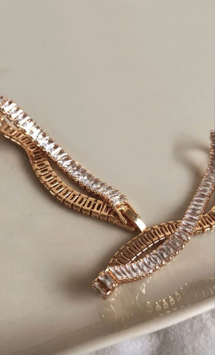 Collar de zirconia AAA Corte Emeral de acero quirúrgico bañado en Oro 18k. Con cierre pato de 37cm. Mide 6mm de ancho.